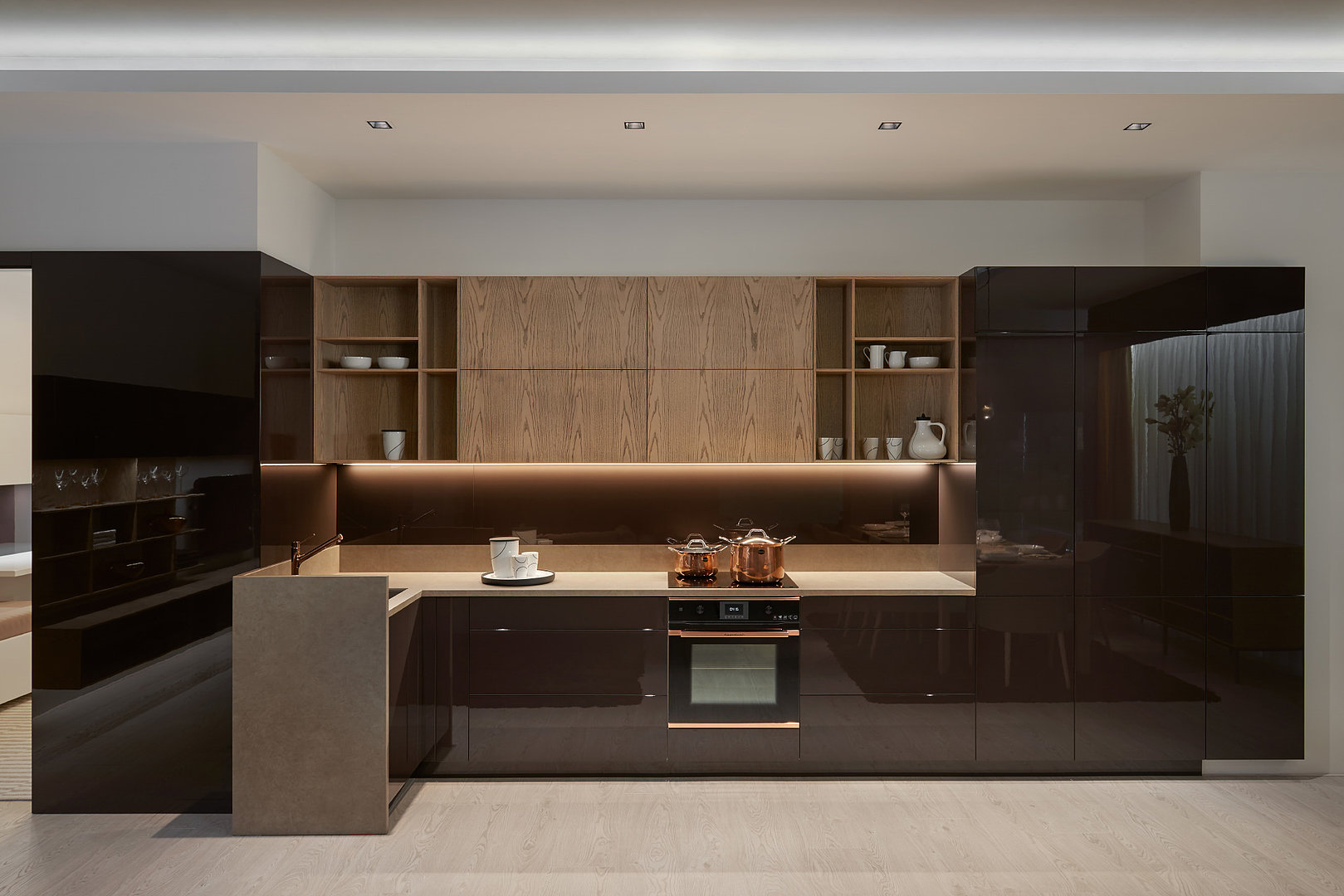 Boky kuchyně s lakovanými vysokými skříněmi doplňuje vnitřní část zajímavě kombinovaná se strukturovanou dýhou.
