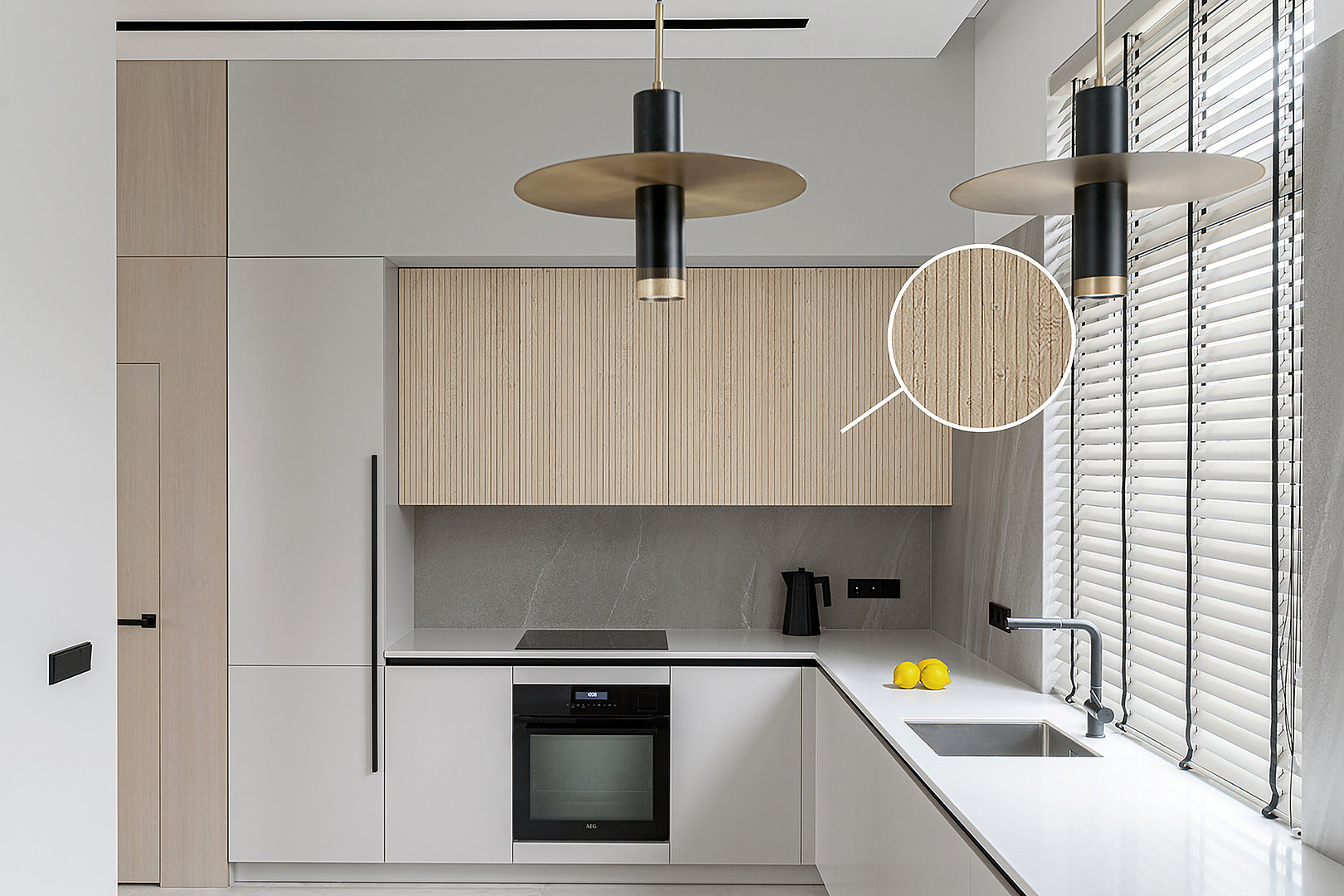 a symetrické drážky. Tento unikátní vizuální dojem, který drážky vytváří, přidává interiéru na dynamice a zároveň působí uklidňujícím dojmem, díky své symetrii a opakování.