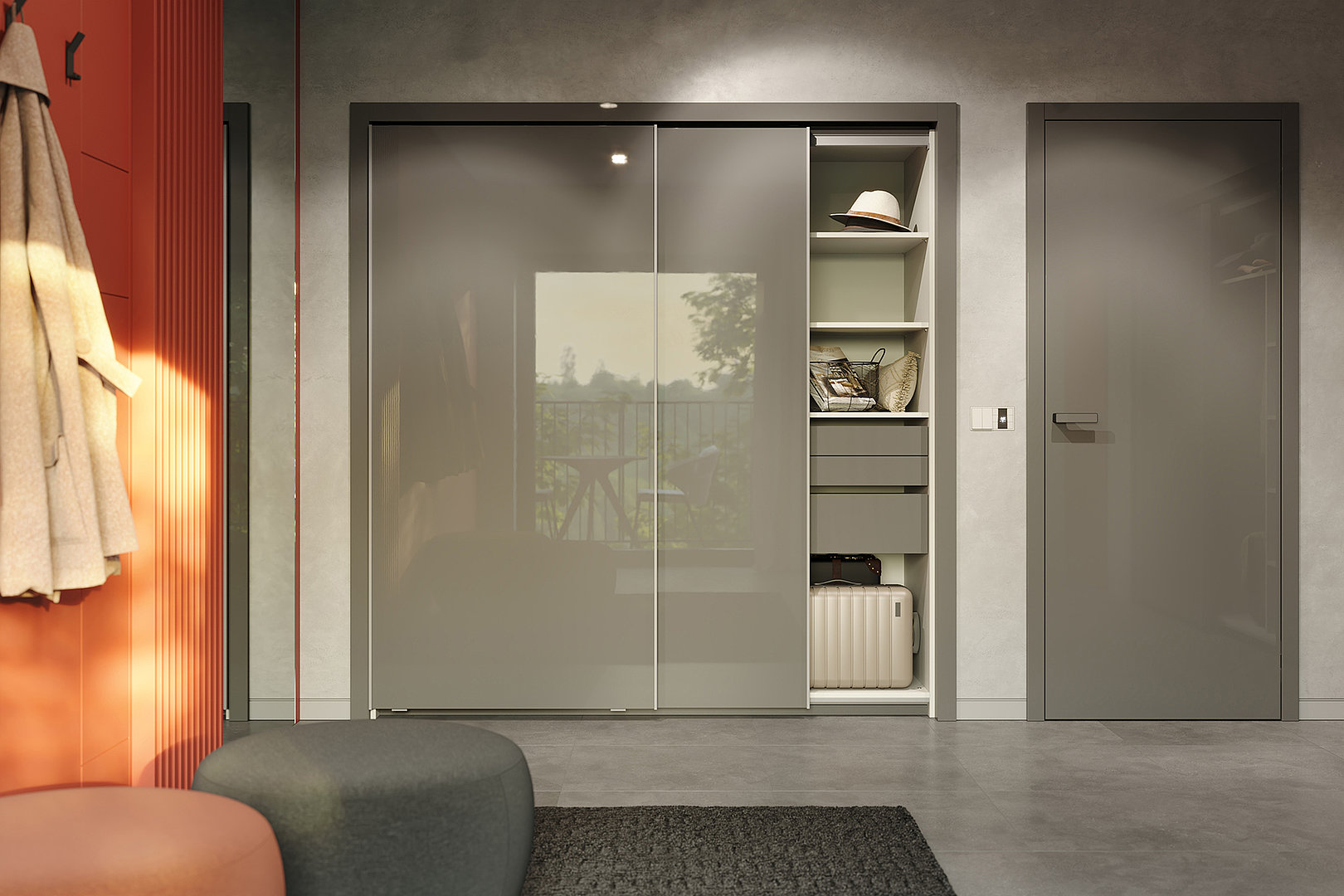 šatní skříně dává vyniknout zvolenému materiálu a posuvné otevírání nabízí zajímavé kombinace a originální vzhled při jejím otevření.